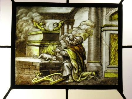 Het glasraampje met een gebrandschilderd medaillon "David brengt een brandoffer" was in stervorm gebroken. Drie kleine glasfragmenten waren uit het medaillon gevallen en gingen verloren. De Vrienden van Zoutleeuw hebben drie offertes gevraagd en met de toestemming van Monumenten en Landschappen de restauratie toevertrouwd aan gediplomeerd restaurateur en glazenier Warner Berckmans uit Diest, die het medaillon in 2000 op een zeer professionele manier gerestaureerd heeft. De open ruimtes werden opnieuw discreet opgevuld. Onze vereniging heeft deze restauratie volledig voor haar rekening genomen. In 2005 werd de ganse reeks van 17de eeuwse glasraampjes, volgens de traditie afkomstig uit de Leeuwse paterskamer, uit de versleten houten lichtbakken genomen en professioneel ingewerkt in de nieuwe tentoonstellingskasten in de vernieuwde schatkamer en de heringerichte grafkapel, waar ze beveiligd en opgelicht sinds april 2006 veel beter tot hun recht komen.